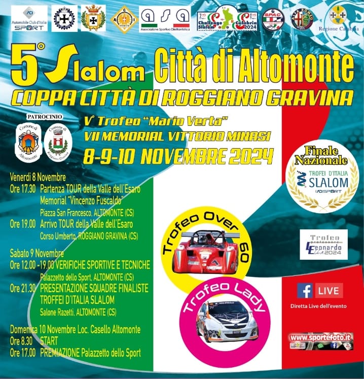Contributo per organizzazione di: 4° Slalom Città di Amendolara, gara Nazionale Aci Sport valida per la (Coppa Italia 4 zona) - - 1° Slalom del Pollino Coppa Città di Morano Calabro;- 2° Slalom Città di Cellara;- 5° Mini Slalom Città di Torano;- 5° Slalom Città di Altomonte (Finale Nazionale Trofei Slalom d’Italia)
